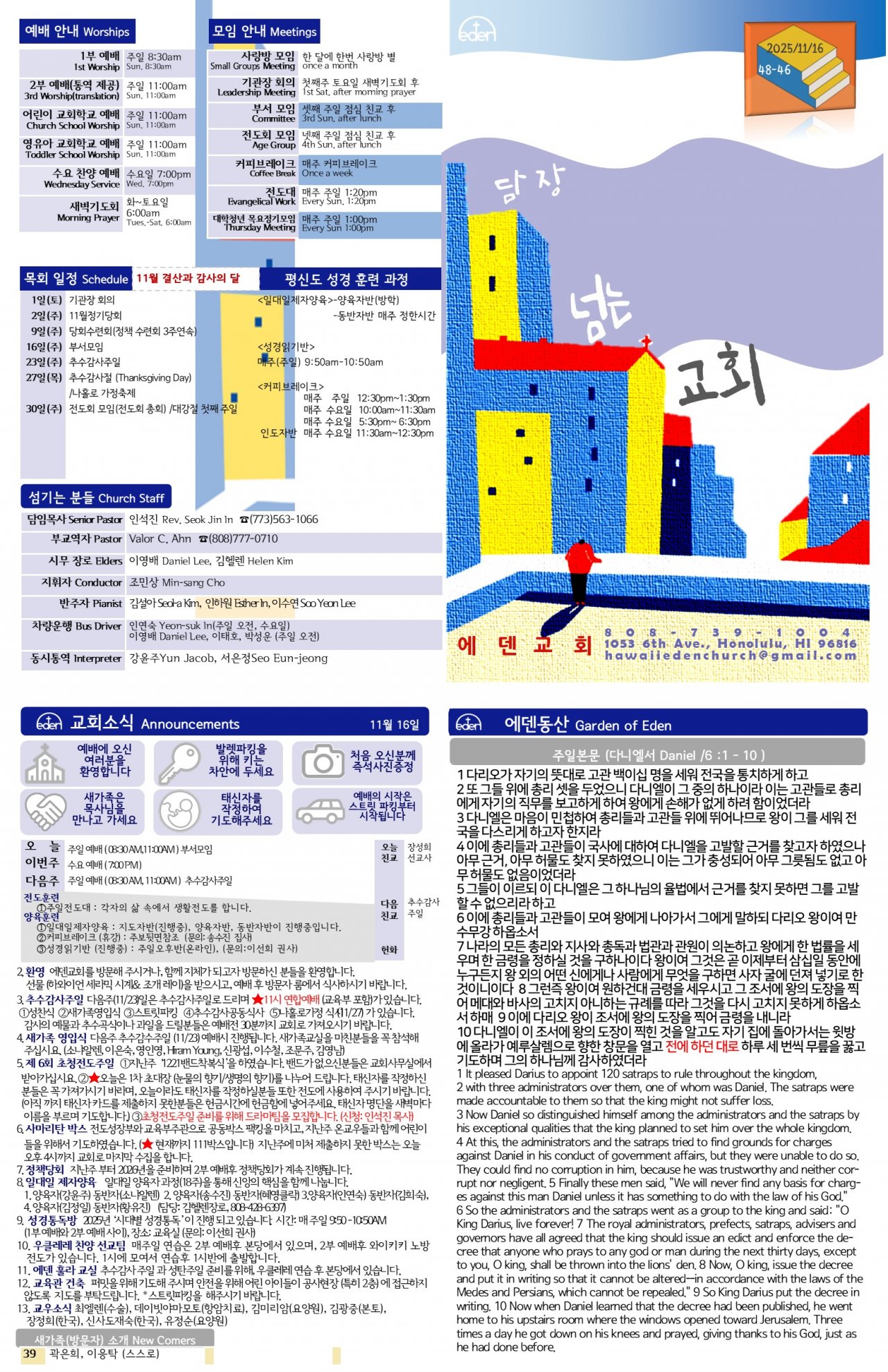 2025/ 11/ 16 하와이한인교회 에덴장로교회 주보