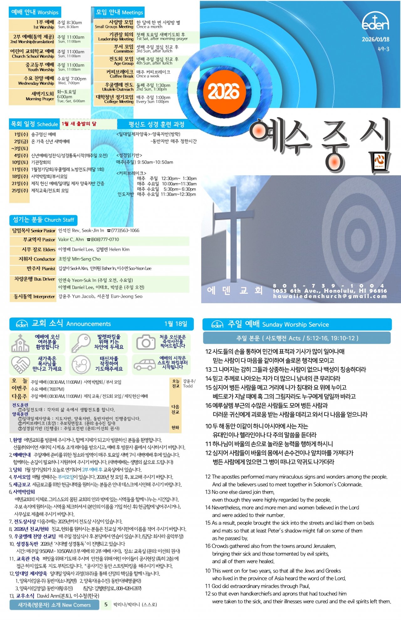2026/ 1/ 18 하와이한인교회 에덴장로교회 주보