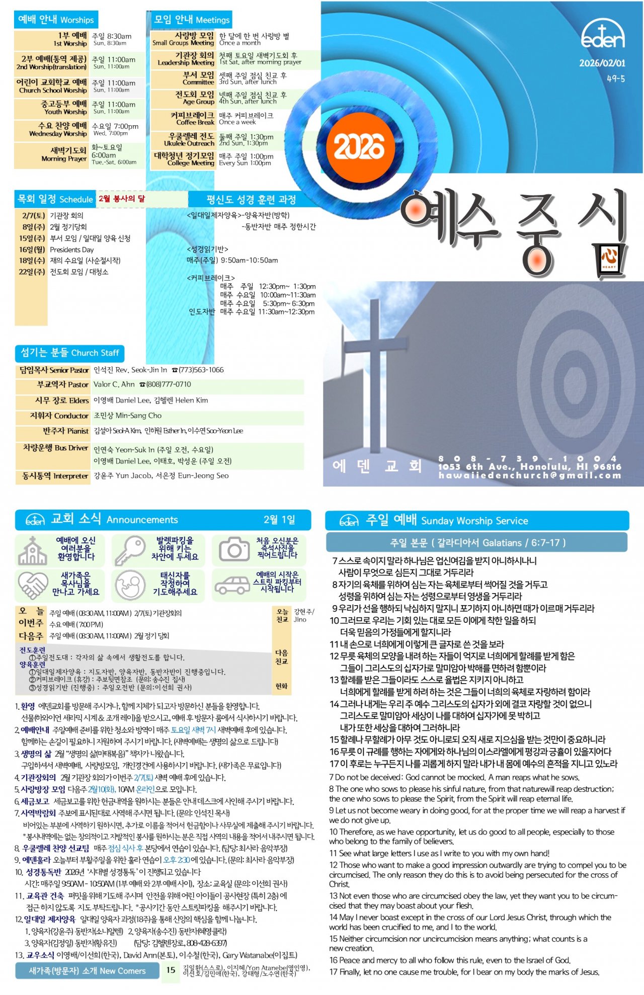 2026/ 2/ 1 하와이한인교회 에덴장로교회 주보