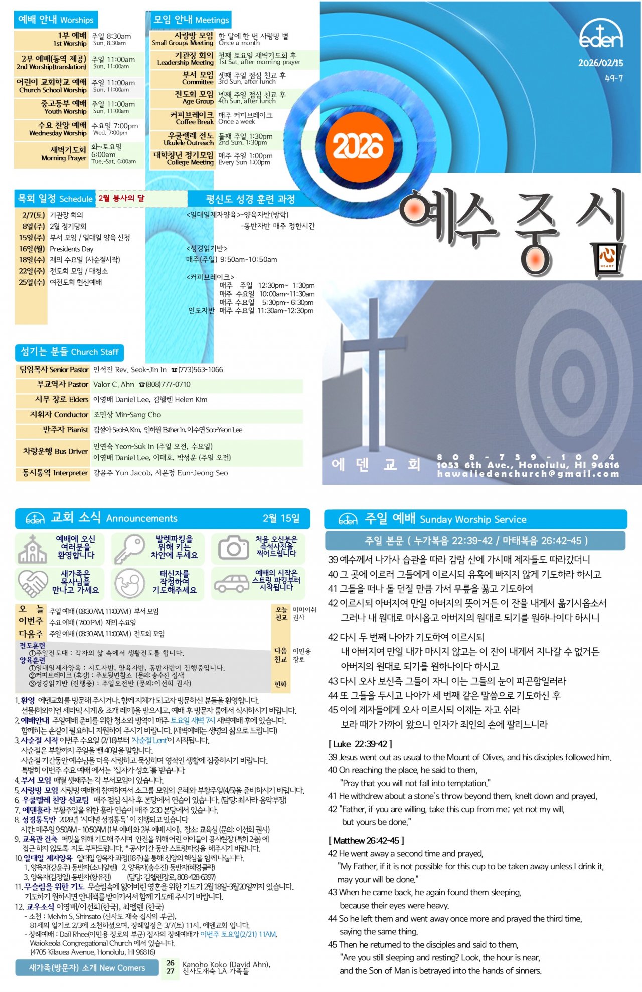 2026/ 2/ 15 하와이한인교회 에덴장로교회 주보